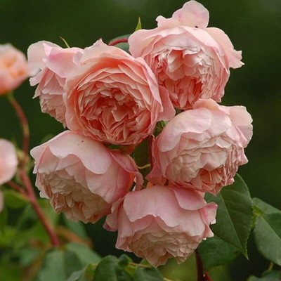 Английская роза — это мощное растение, которое в благоприятных условиях может достигать высоты 120-150 сантиметров. Куст отличается раскидистой формой, гибкими побегами с небольшим количеством острых шипов, а также обилием мелких темно-зеленых листьев с выраженной матовостью. Корневище развито хорошо.